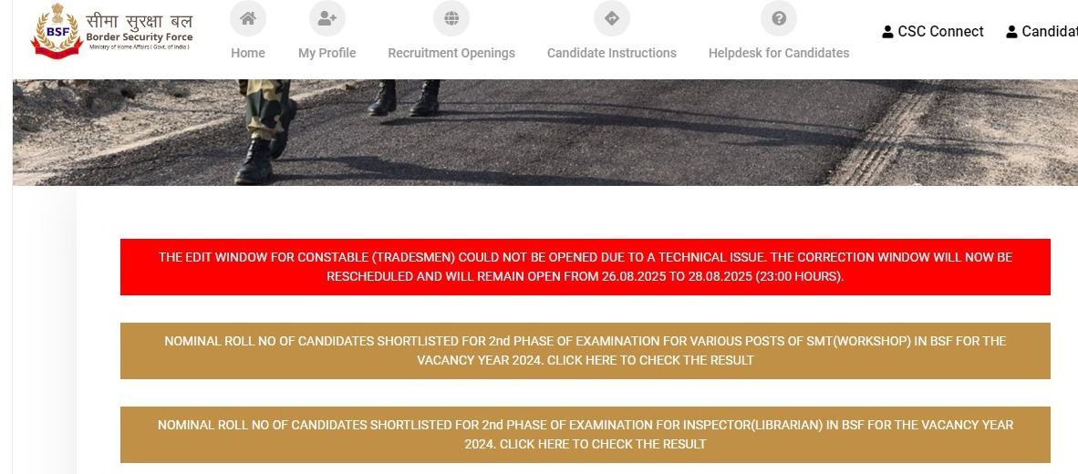 | Visit the official BSF recruitment portal Open the official recruitment website of the Border Security Force using your browser. Find the Admit Card section On the homepage, look for the option related to Constable Tradesman Recruitment or PET/PST Admit Card under the latest notifications or candidate login section. Open the Admit Card download option Click on the option that mentions PET/PST Admit Card for Constable Tradesman. Login with your details Enter the required credentials such as: Registration Number or Roll Number Date of Birth or Password Then submit the details. View the Admit Card Your PET/PST admit card will appear on the screen after successful login. Download the Admit Card Download the admit card in PDF format. Print the Admit Card Take a clear printout of the admit card. It is advised to keep multiple copies for safety. |