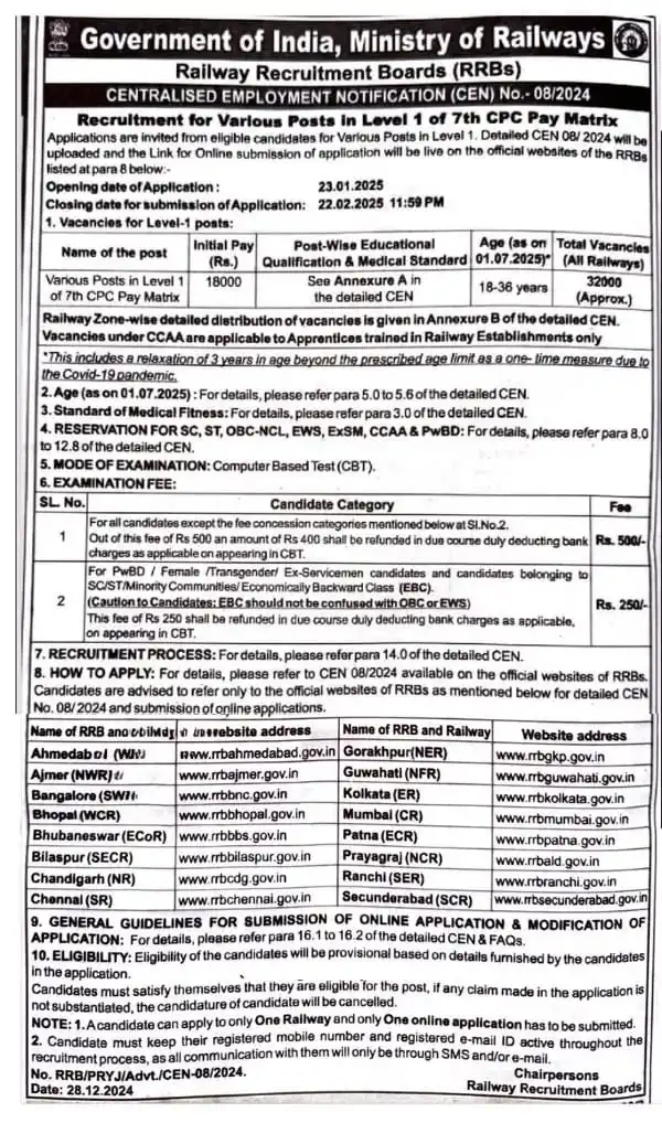 | Notification Date : 28 December 2024 Online Apply Start Date : 23 January 2025 Online Apply Last Date : 01 March 2025 Last Date For Fee Payment : 03 March 2025 Correction date : 04-13 March 2025 Exam Date : 27 November 2025 – 16 January 2026 Exam City Details : 19 November 2025 Admit Card : 24 November 2025 Available Now Result Date : Will Be Updated Here Soon Candidates are advised to confirm from the RRBofficial website. | For General, OBC, : ₹ 500/- For SC/ ST/ EBC / Female / Transgender : ₹ 250/- Refund Amount (On Appearing For CBT) For General, OBC, : ₹ 400/- For SC/ ST/ EBC / Female / Transgender : ₹ 250/- Payment Mode (Online): You can make the payment using the following methods:Debit Card Credit Card Internet Banking IMPS Cash Card / Mobile Wallet |