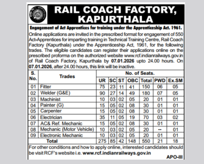 | Minimum Age : 15 Year Maximum Age : 24 Year RCF provides age relaxation for the Rail Coach Factory Kapurthala (RCF) Apprentice position as per their regulations. | 550 Post | ||